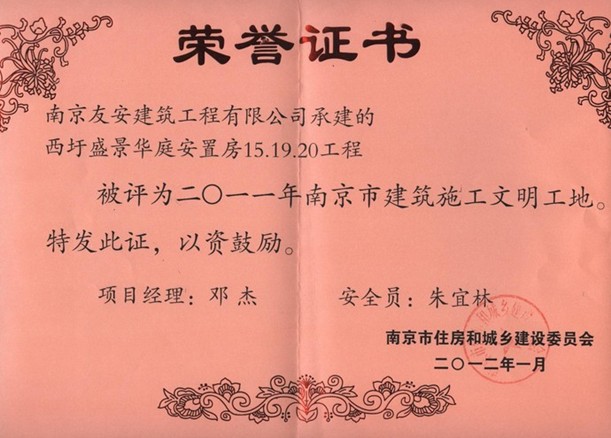 由南京友安建筑工程有限公司承建的“西圩盛景华庭安置房工程”荣获2011年度南京市建筑施工“文明工地”奖。
