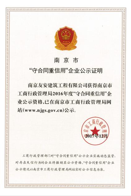 南京市工商行政管理局2016年“守合同重信用”企业 发表时间:2018-1-5阅读次数:3456 上一篇文章:南京市工商行政管理局2015年度“守合同重信用”企业 下一篇文章: 江苏省工商行政管理局2015-2016守合同重信用企业