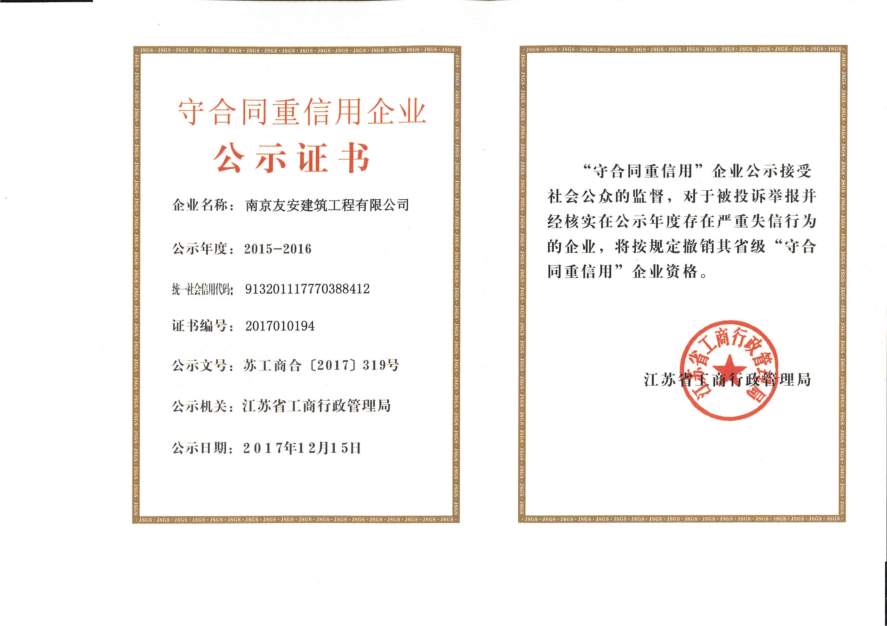 江苏省工商行政管理局2015-2016守合同重信用企业 发表时间:2018-3-3阅读次数:3431 上一篇文章:南京市工商行政管理局2016年“守合同重信用”企业 下一篇文章: 江苏省企业信用管理协会会员